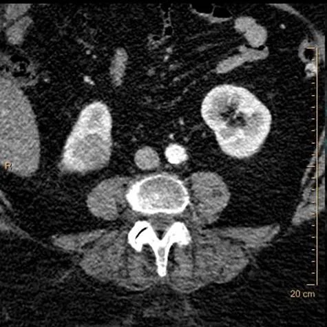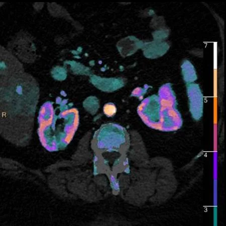 Careful look at the kidneys on conventional CT in this case might reveal lesions, but spectral CT makes them really easy to pick up.