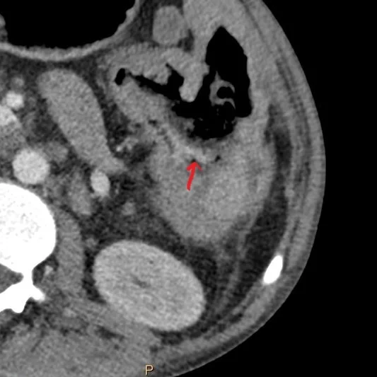 Ill-defined density in the posterior aspect of the fistula shows clear iodine uptake and is consistent with active GI bleed. Patient was stabilized and taken to the operating room, with extensive surgery confirming B-cell lymphoma.