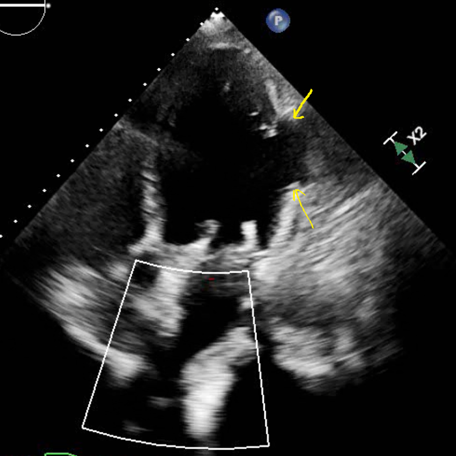 Echocardiogram (HLA view) shows obvious lateral wall aneurysm (yellow arrows)