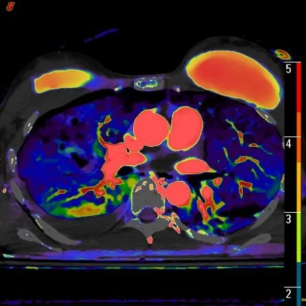 Iodine map shows increased perfusion surrounding the lung lacerations. There is also increased perfusion in the area of lung contusion compared to contralateral lung.