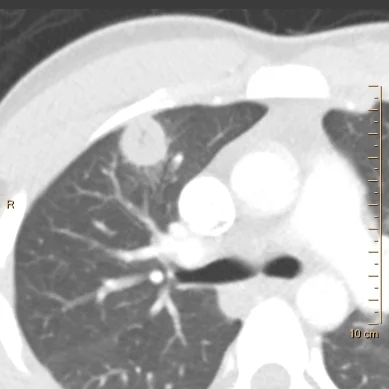 27 yo M, h/o IV drug use, presented with chest pain. CT with contrast performed according to the PE protocol shows a 2.2 cm nodule in the peripheral right upper lobe, with a subtle central cavitation.