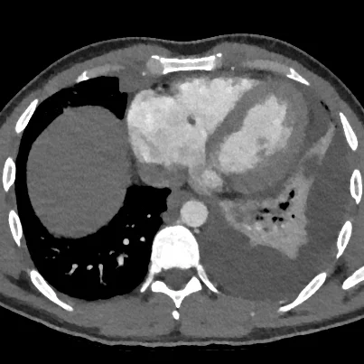 Careful analysis shows a small filling defect adjacent to the tricuspid valve, and a dilated right atrium. Tricuspid endocarditis confirmed on echocardiography.