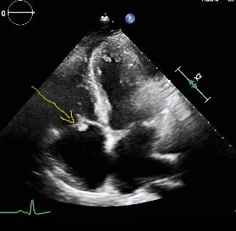 Image from transthoracic echocardiogram confirms vegetation on tricuspid valve (yellow arrow)