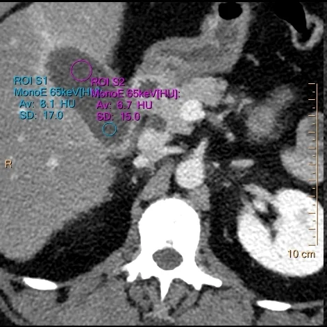 ROI placed over expected location of gallstone (blue) and bile (magenta) on convantional CT show nearly identical density (8.1 vs 6.7 HU)