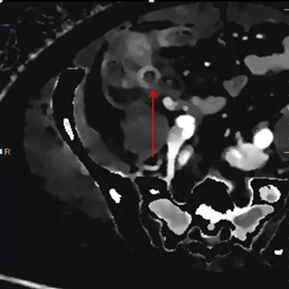 Iodine density image. Note focal discontinuity in appendix enhancement (red arrow). This is consistent with perforation.