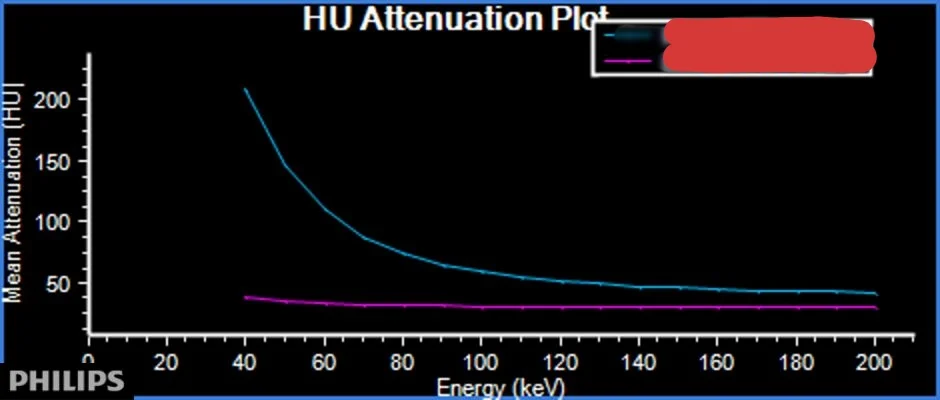 Spectral plots on delayed image: Magenta curve from an ROI on the MI is flat, consistent with lack of iodine. The ROI in the interventricular septum shows significant increase on lower keV, consistent with iodine uptake.