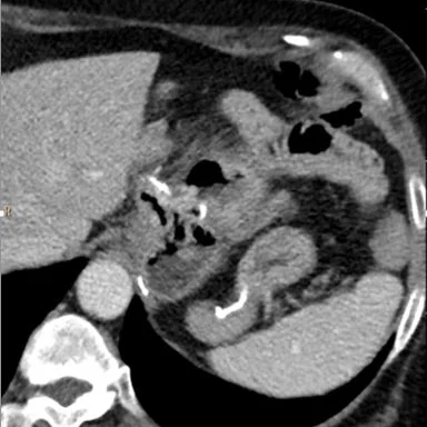 53 year old female with prior Roux-en-Y gastric bypass (6 years ago) and ongoing tobacco use presents with abdominal pain and melena. Hemoglobin came back at 9.5 mg/dL. A CT scan was obtained. Conventional images show subtle abnormality at the gastrojejunostomy site. Iodine map shows clear large defect in wall enhancement adjacent to the GJ anastomosis, consistent with an ulcer.