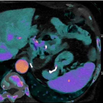 Iodine map: The wall discontinuity from the marginal ulcer (orange arrow) is obvious.