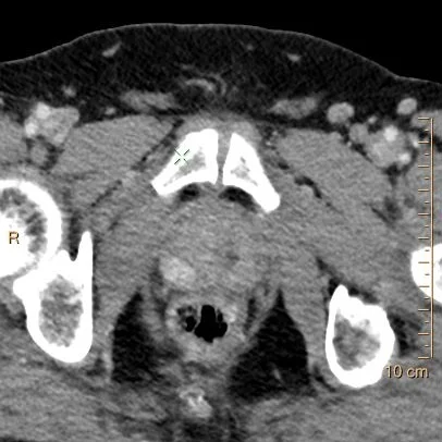 65 yo M presents with abdominal pain. Routine CT of the abdomen obtained, showing the usual cysts in kidneys and liver, diverticulosis and a mildly enlarged prostate. Look carefully, and there is a small enhancing nodule in the right posterior peripheral zone. This measures about 125 HU, as opposed to 75 HU in the left peripheral zone (standard deviation is about 15-20 HU). This is a ratio of about 1.66.