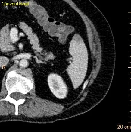 55 yo F with long-standing Crohn disease presents with abdominal pain. CT scan shows distal small bowel obstruction, with mucosal hyperenhancement, consistent with a Crohn related stricture. There are wedge shaped hypodensities in the right kidney with absent iodine uptake, consistent with infarcts.