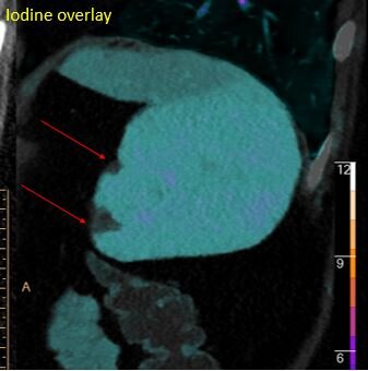 Iodine overlay shows there are actually 2 infarcts present (red arrows).