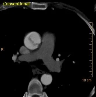 CT shows linear filling defect in ascending aorta. We worry this is a dissection, but looks odd. So we do a gated CT, which shows mobile wall-adherent thrombus in the ascending aorta. The video is heart-stopping, and on my twitter feed (@CtSpectral).
