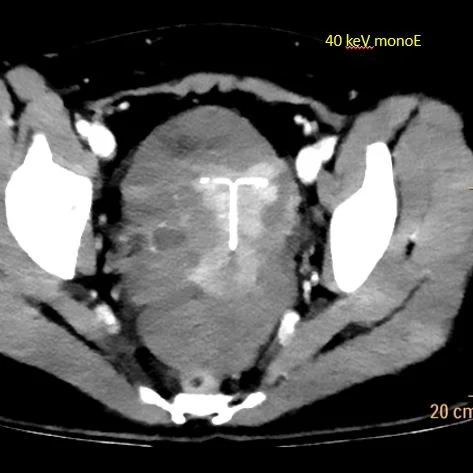 Iodine map: See perfusion to the uterus, and absent perfusion posterior, c/w clot.