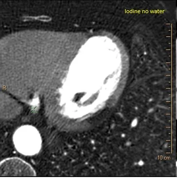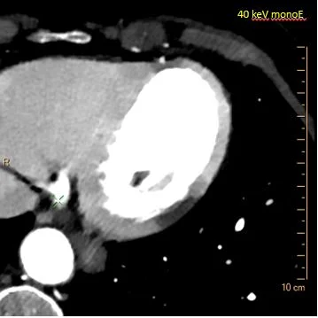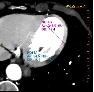 As I look at the images, I notice a small area of hypoenhancement in the lateral wall of the left ventricle. I am not entirely sure if this is real, so I look at Spectral CT images. And boy, were they convincing!