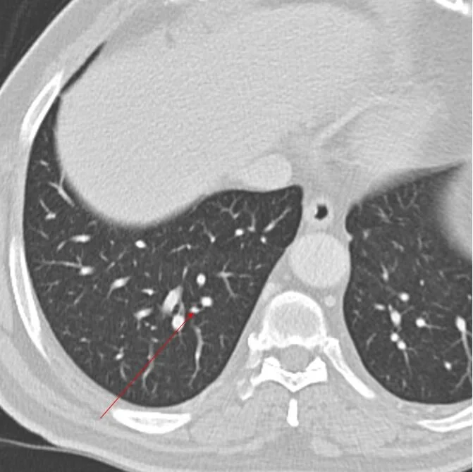 CT 2 years after nephrectomy. Tint RLL lung nodule.