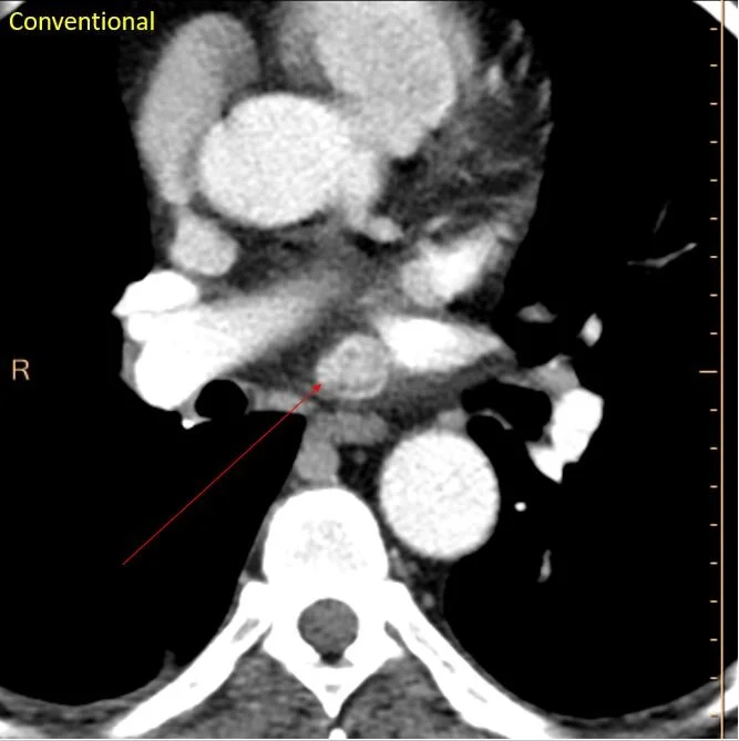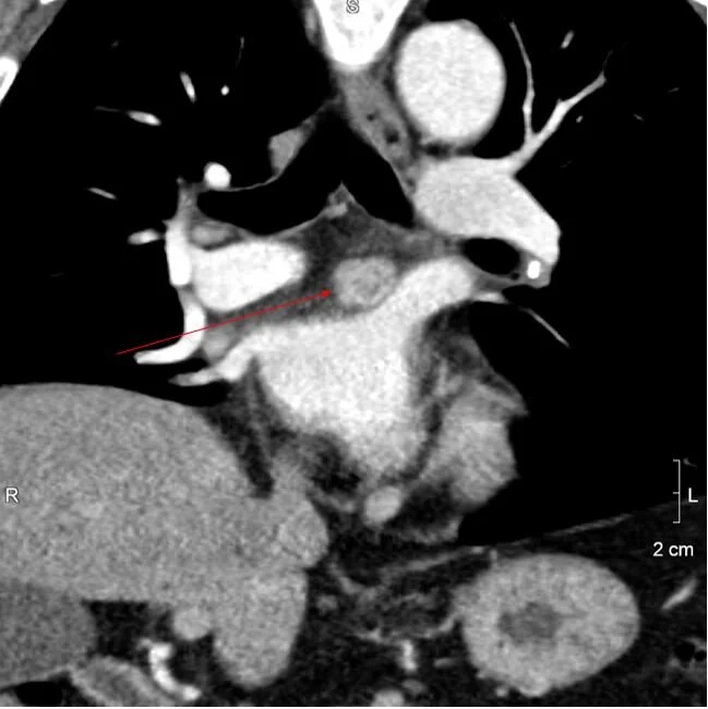 CT a couple of years later. Intensely enhancing subcarinal nodule.