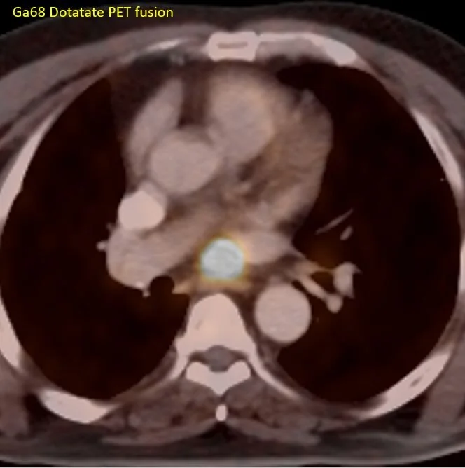 Dotatate scan: The nodule shows uptake, consistent with neuroendocrine tumor. Note physiologic uptake in the spleen, adrenals and kidneys, as well as uncinate process of pancreas.