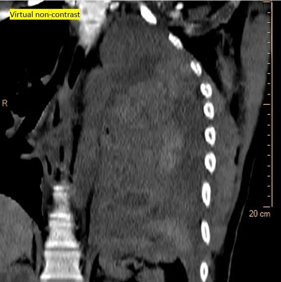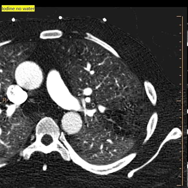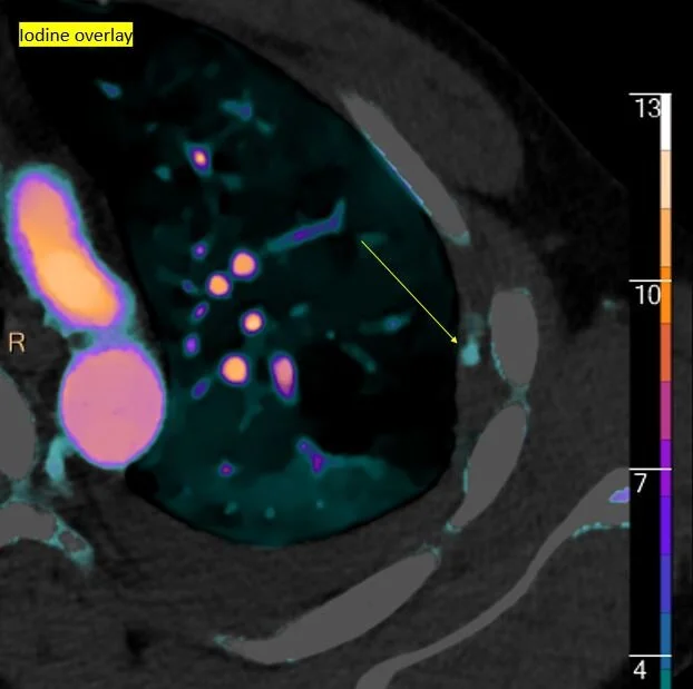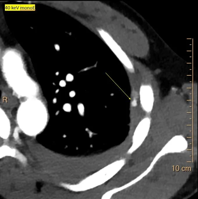 A few days prior to the massive hemothorax, he presented with pleuritic chest pain. CXR showed a small pleural effusion. On conventional CT, there is a small area of pleural thickening in the left upper lobe, near the previous infarct. On Spectral CT, a small aneurysm is clearly visible on the 40 keV image and iodine map. This is what bled a few days later.