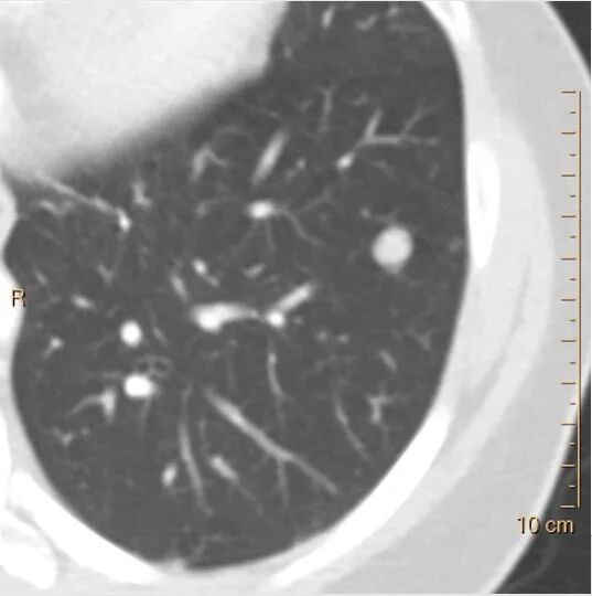 A 50 year old female shows up for screening mammogram. My colleague picks up a 9 mm nodule in the right breast. Biopsy shows invasive carcinoma. As part of workup patient undergoes a chest CT with contrast, which shows a 1 cm non-calcified nodule in the left lower lobe.