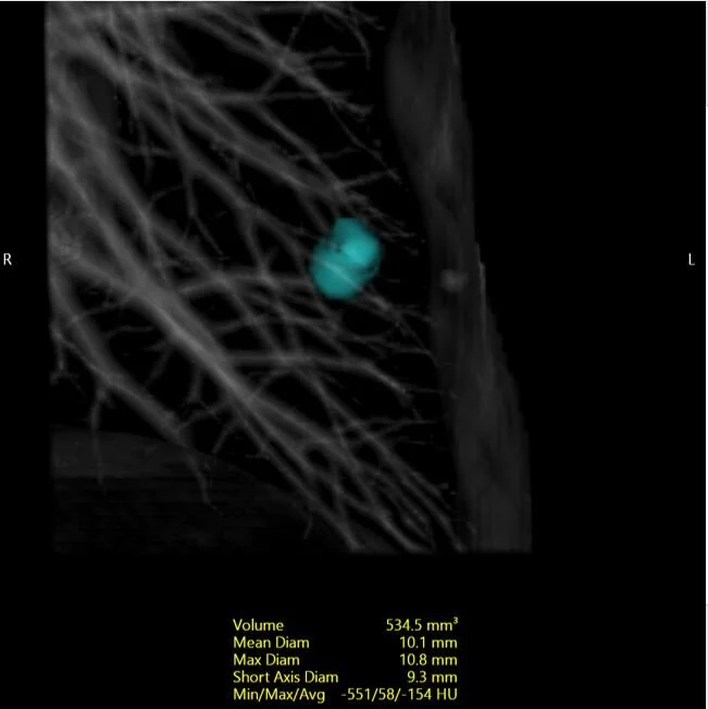 Spectral CT shows that this nodule has no iodine uptake or enhancement. This is highly suggestive of a benign etiology. This paper from 2008 is a great reference, and you can find additional references here and here. Followup was recommended, and 7 months later (delayed because of the small issue of a virus) the nodule is unchanged. In the interval, patient has had an uncomplicated lumpectomy and node dissection.