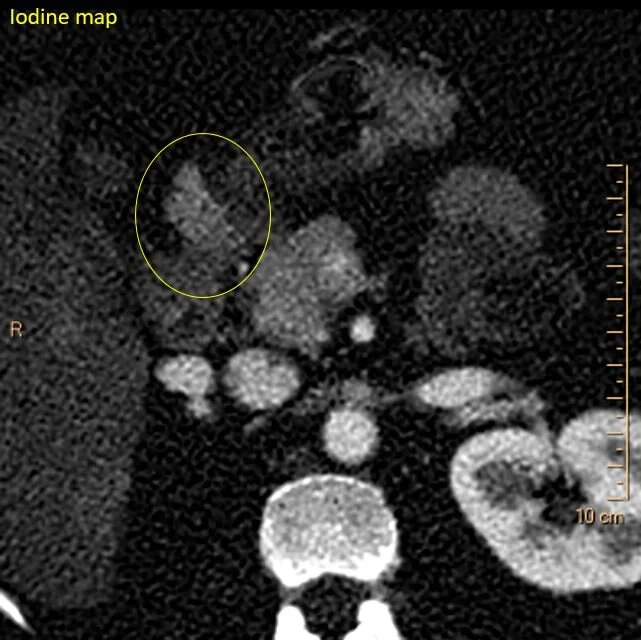 On the lower keV images, there is an intensely enhancing mass at the undersurface of the pylorus/duodenal bulb. This is nicely depicted on the iodine map. On spectral curves, this is identical to the pancreas.